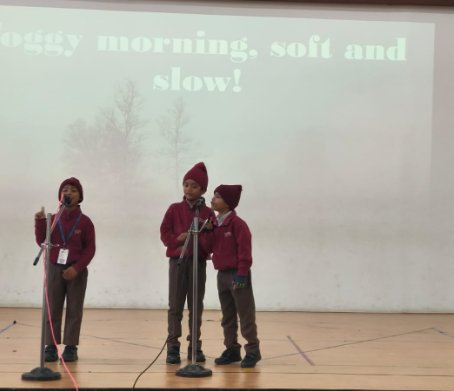 Students introduced the theme by describing foggy mornings, cozy blankets, colorful sweaters, and festive celebrations that make winter special. A melodious winter song set a cheerful mood, after which a humorous skit showcased the funny side of Bengaluru winters—sleepy mornings, sneezy noses, and misty streets.