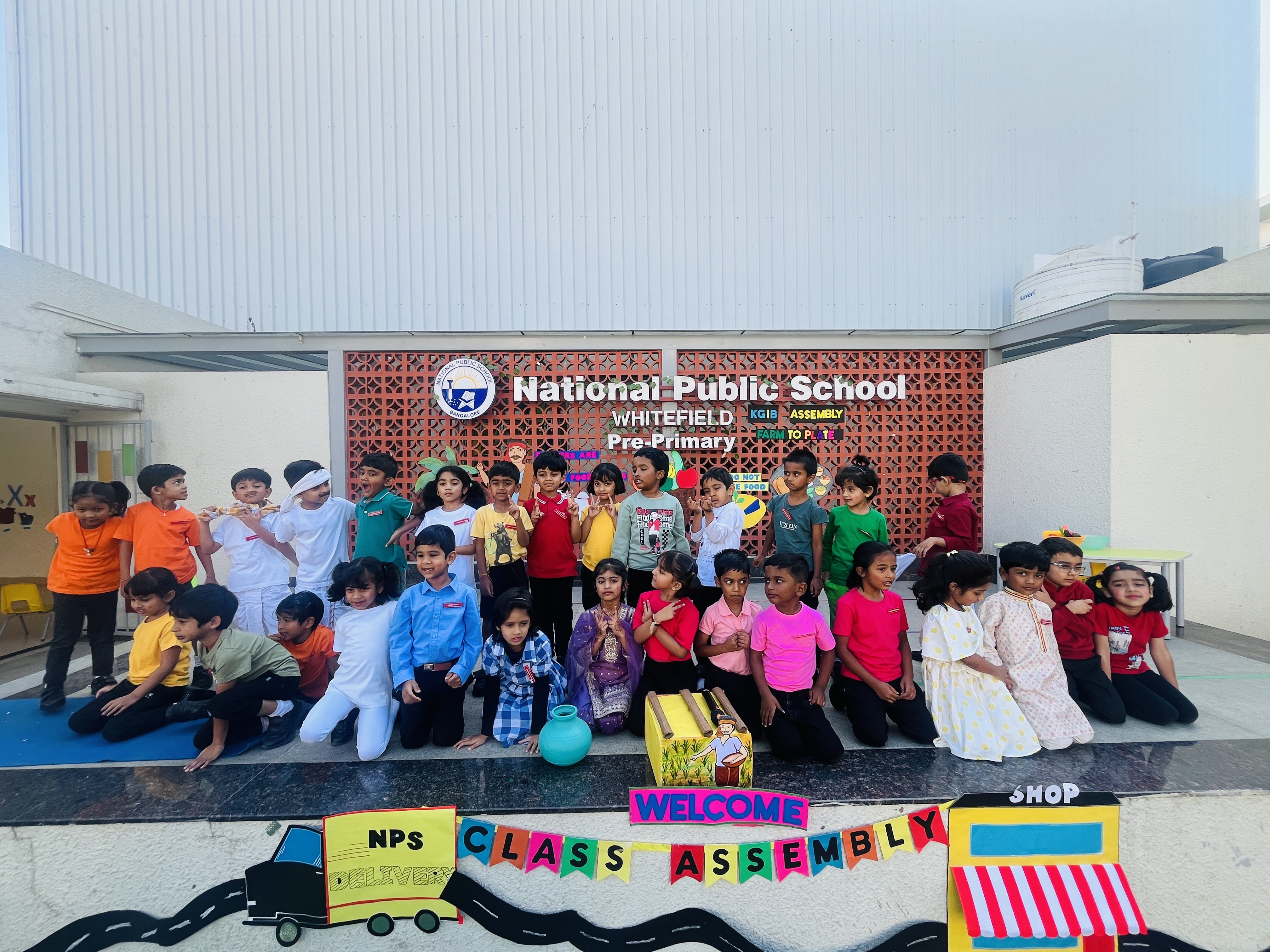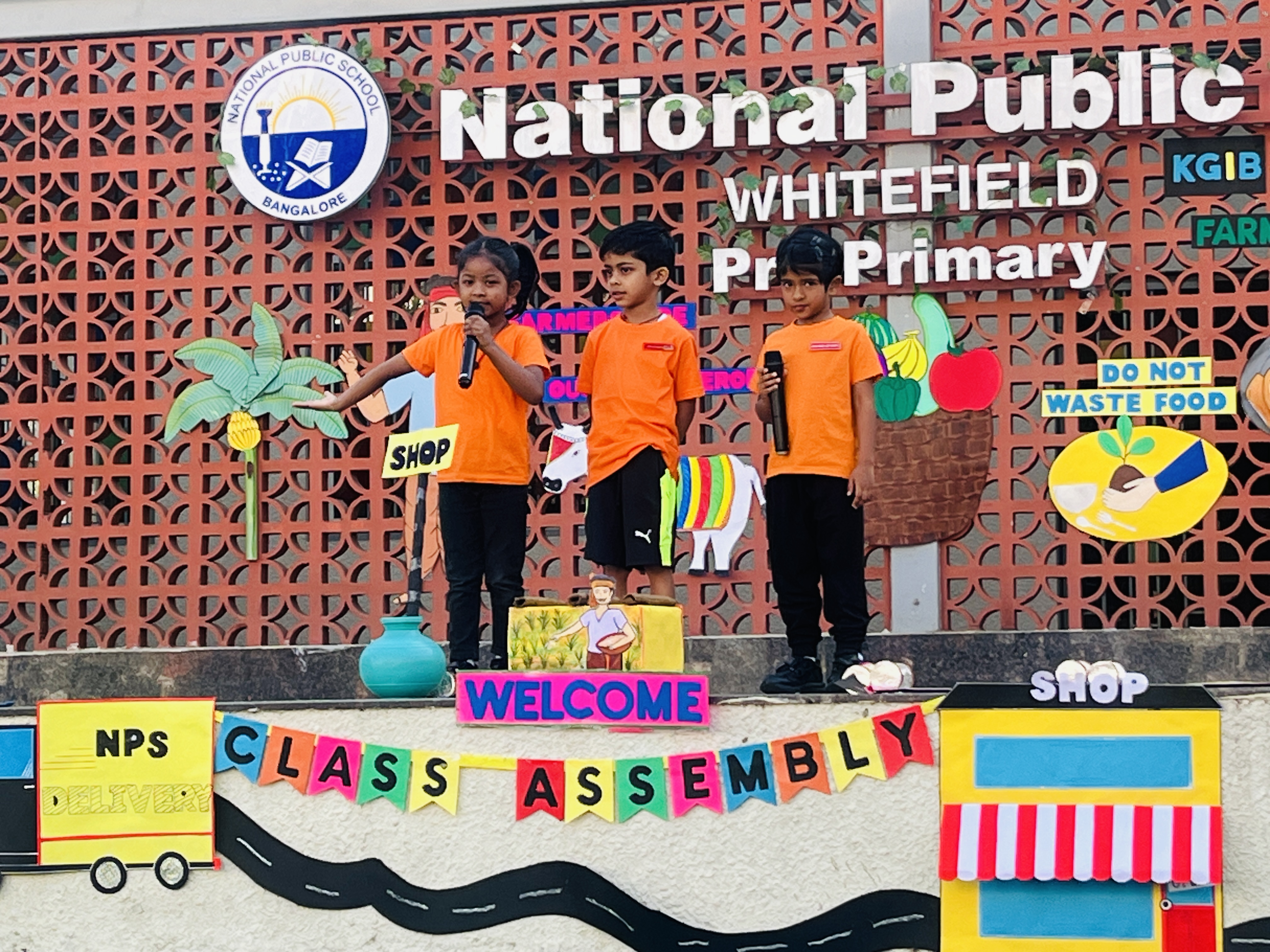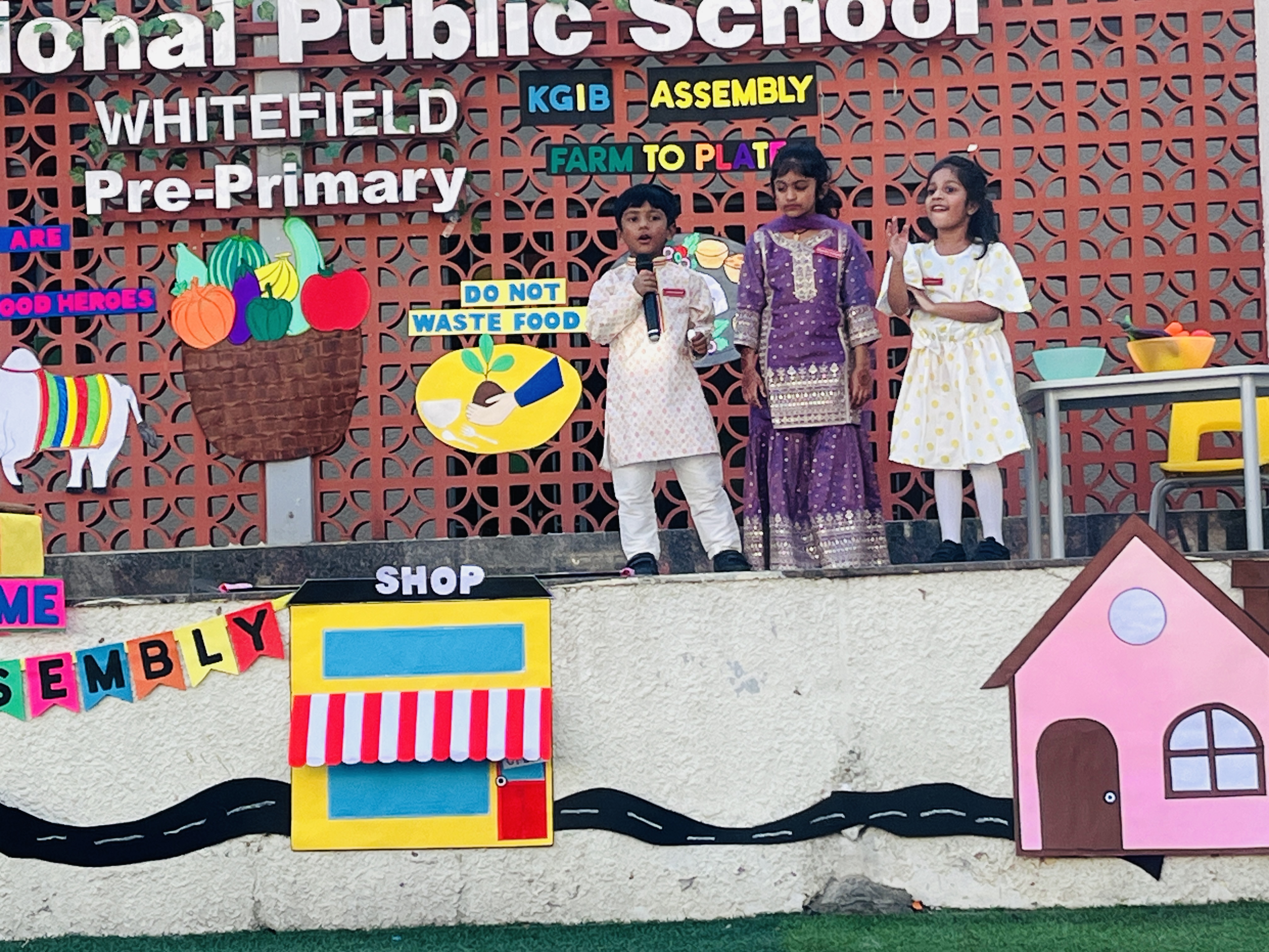 KG1B - ASSEMBLY ‘FARM TO PLATE’ The KG1B students confidently presented a class assembly on the topic 'Farm to Plate.' This lively and colourful presentation helped them develop awareness about healthy eating habits and the importance of respecting farmers. They understood how farmers grow, harvest and transport fruits and vegetables. They also learnt how we buy them from supermarkets and cook them, to have food served on our plates.