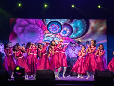 The students dressed in resplendent colourful costumes set the stage on fire, with astounding diverse genres of music; Indian classical, devotional, Western, Pop, and Reggae.